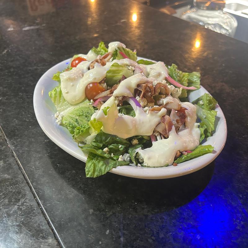 Chopped romaine, bacon, crumbled bleu cheese, bleu cheese dressing, red onion, and cherry tomatoes.